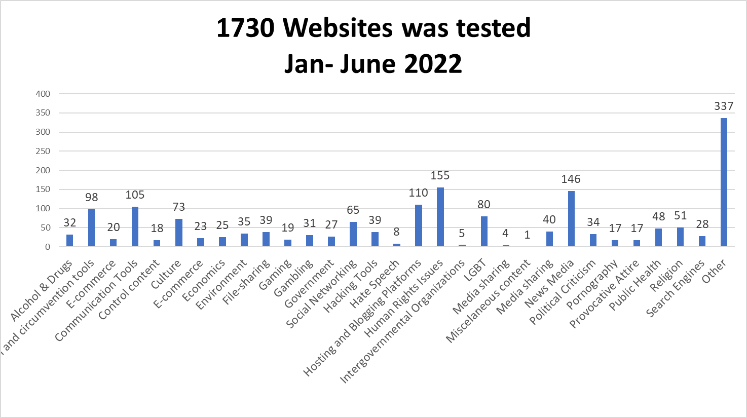 The OONI explorer measurements collected from Jan to June 2022 show that 43 websites (national and Intergovernmental Organizations website) are blocked by DNS, mainly by VIETTEL (CAMBODIA) PTE., LTD. (AS38623) and S.I Group (AS38623). The highest number of blockings were found to be in Gambling and News Media categories.