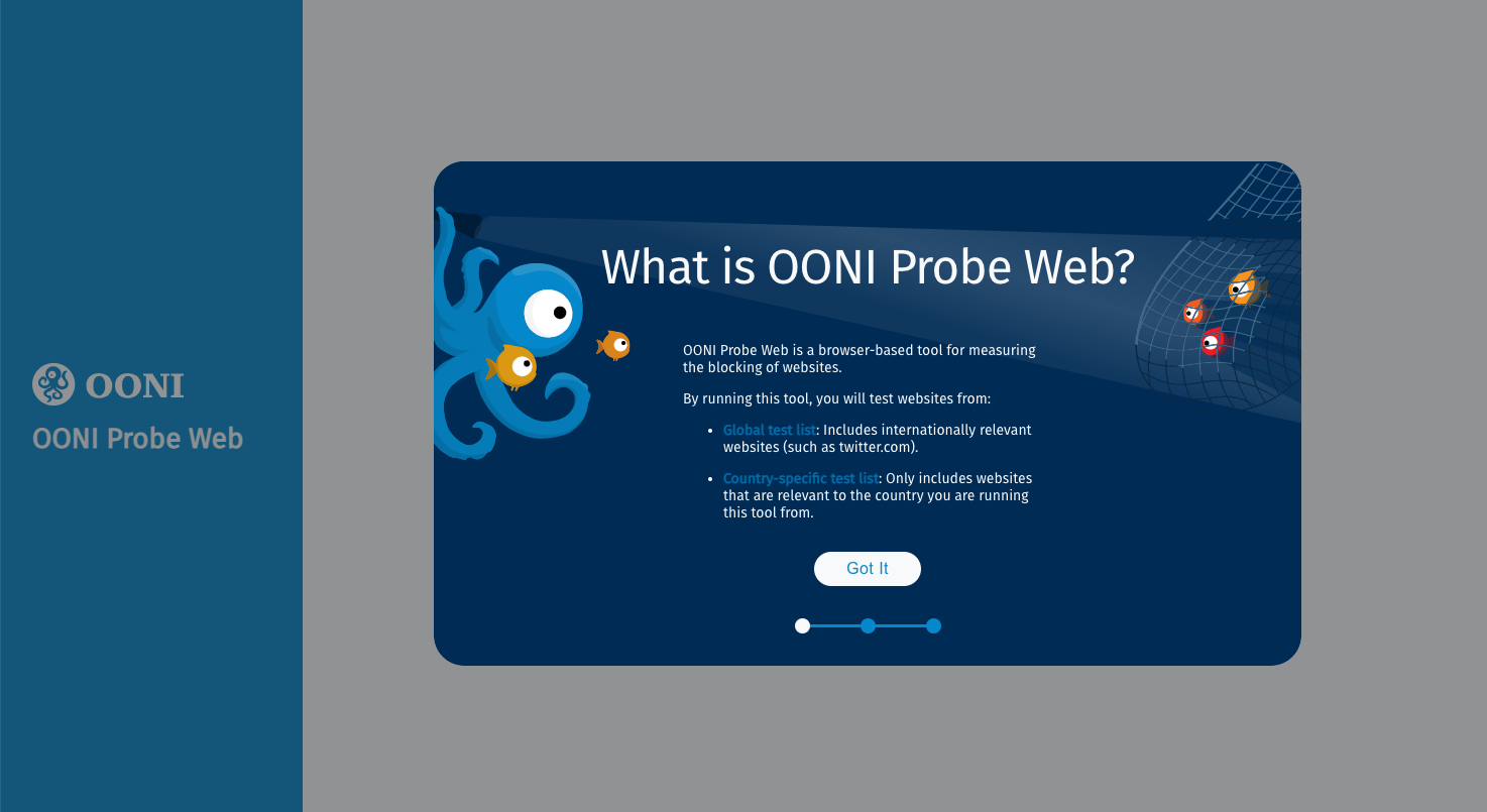 - Informed consent procedure. During the onboarding process, users are informed about what OONI Probe Web does, what type of data is collected, which websites are tested, potential risks, and that test results are published as open data. Through a quiz (similarly to the OONI Probe apps), users are required to provide their consent as a prerequisite to using the tool.